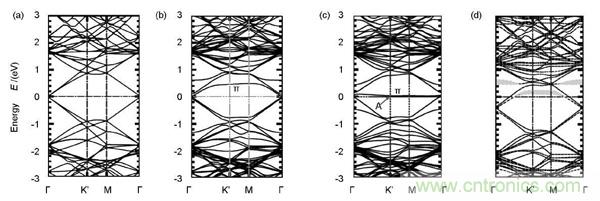 圖3.不同類型石墨烯能帶結(jié)構(gòu):(a)完整石墨烯;(b)585-V2缺陷;(c)S-W缺陷;(d)N 石墨烯