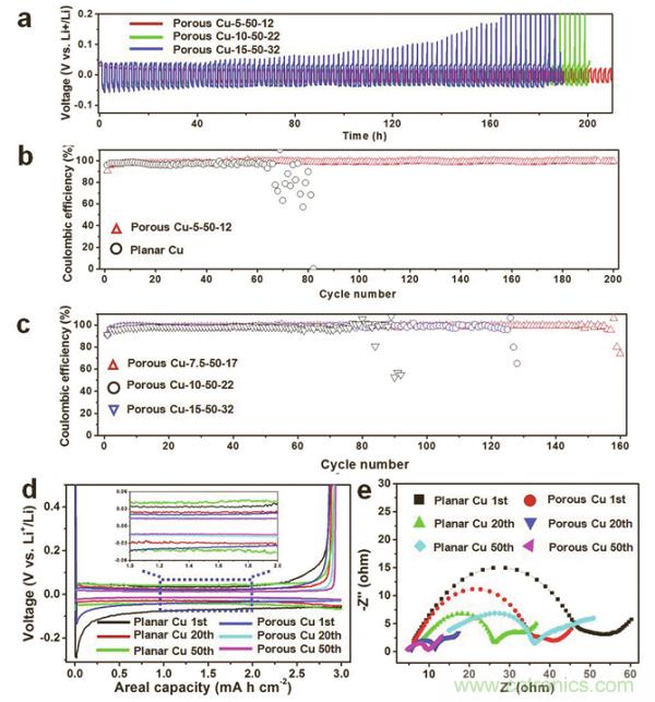c)鋰沉積在多孔Cu-7.5-50-17、Cu-10-50-22、Cu-15-50-32時(shí)的循環(huán)穩(wěn)定性能及庫(kù)倫效率