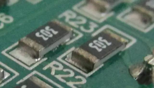 下圖是兩顆電極氧化了的貼片電阻(電極表面有點(diǎn)黑),別看它們現(xiàn)在好好的,一旦電路進(jìn)入了惡劣的工作狀態(tài)(高溫高濕),電阻就會(huì)因?yàn)樘摵付闺娐饭ぷ髟诓豢深A(yù)測(cè)的狀態(tài),繼而損壞。