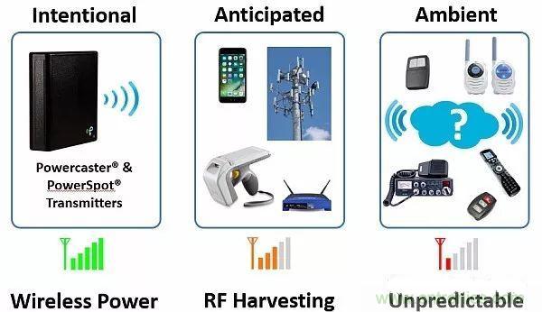 在壁櫥或梳妝臺抽屜中可以安裝類似手機發(fā)射器的小功率射頻發(fā)射器。這種發(fā)射器可以為可穿戴服裝提供充電區(qū)域。不管可穿戴設(shè)備是在壁櫥里還是在抽屜里,這些設(shè)備的電池都能自動接收涓流充電。這種方法與接收器需要依賴一定頻率范圍內(nèi)的隨機射頻信號的場景不相干。圖9給出了射頻電源種類。
