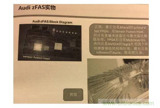 由于目前融合多是雷達與攝像頭融合,所需要的帶寬,一般的ASIC都能夠滿足。但是要融合激光雷達,則最好用FPGA,F(xiàn)PGA做傳感器Hub是最合適不過的。同時傳感器融合目前應(yīng)用較少,合適的ASIC并不好找,F(xiàn)PGA成為主流選擇。同時,對一些精度要求較高的雷達,如使用單精度浮點處理實現(xiàn)一個4096點FFT,采樣點越多,誤差就越小,但運算量會大幅度增加。它在每個時鐘周期輸入輸出四個復數(shù)采樣。每個FFT內(nèi)核運行速度超過80 GFLOP,這一般需要FPGA才能比較好的實現(xiàn)。一般車載雷達的采樣點在512-2048左右,但軍用的可以達到8192,必須配備FPGA。如下圖在AudizFAS的實物中,采用了Altera的CycloneV SoCFPGA,作為sensor fusion,同時負責毫米波雷達與激光雷達數(shù)據(jù)處理。