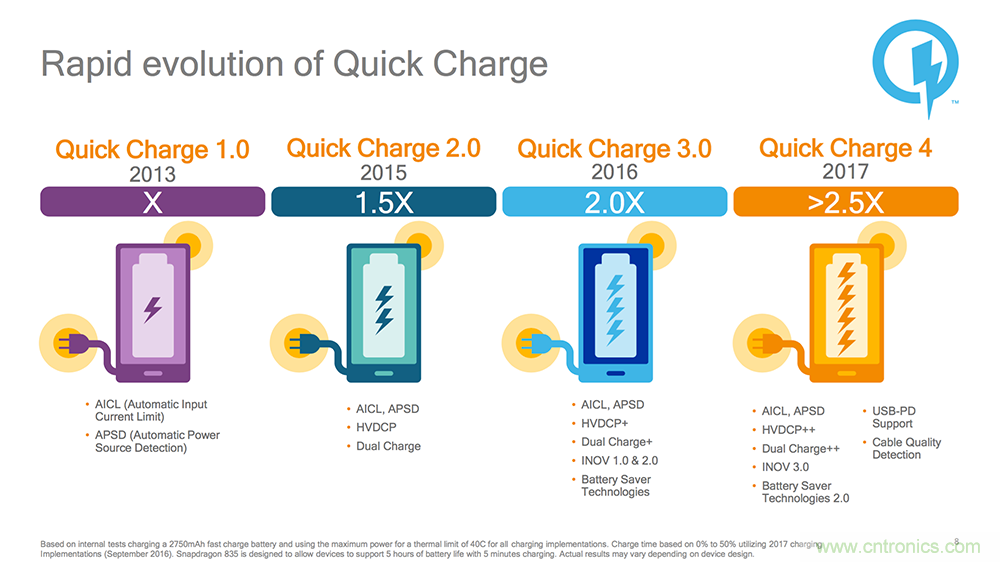 早在 2013 年,高通就意識(shí)到了“快充”對(duì)智能手機(jī)的重要性,當(dāng)時(shí)就推出了 Quick Charge 1.0 標(biāo)準(zhǔn),通過(guò)提高輸入電流來(lái)提高充電效率,讓搭載驍龍 600 處理器的手機(jī)支持“5V 2A”充電。