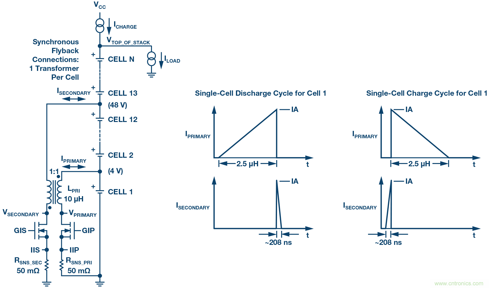 LTC3300-2中的每個(gè)均衡器都使用非隔離邊界模式同步反激式功率級(jí),以實(shí)現(xiàn)每個(gè)電池單元的高效充電和放電。6個(gè)均衡器各自都需要自己的