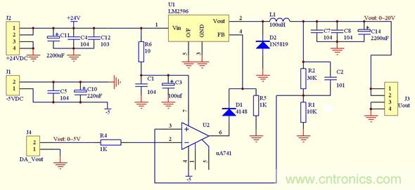 如果我們能夠設(shè)計(jì)出一種可以用電壓調(diào)節(jié)輸出的開關(guān)穩(wěn)壓電路,然后用DAC來(lái)控制調(diào)節(jié)電壓,那么就很容易實(shí)現(xiàn)。問(wèn)題是我們不可能自己重新設(shè)計(jì)一個(gè)DC-DC,如果能把現(xiàn)成的DC-DC集成芯片,通過(guò)修改外圍電路的方式,來(lái)實(shí)現(xiàn)用電壓來(lái)控制輸出,那么問(wèn)題就得到解決。下面,我還是以LM2596-Adj為例,看看怎樣把LM2596-Adj改裝成可數(shù)控的開關(guān)穩(wěn)壓電源。