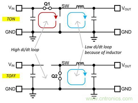 圖 1. 降壓轉(zhuǎn)換器中的電流環(huán)路。VIN 環(huán)路為高 di/dt 環(huán)路。