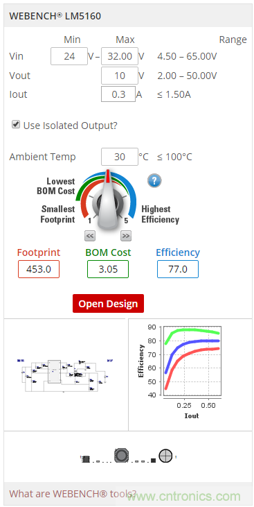在第二個(gè)方法中,你需要確定打算在Fly-Buck設(shè)計(jì)中使用的器件。比如說,你打算在Fly-Buck設(shè)計(jì)中使用LM5160。在LM5160產(chǎn)品文件夾中,你將會(huì)找到一個(gè)專門為這個(gè)器件創(chuàng)建的WEBENCH設(shè)計(jì)工具控制面板(圖4)。