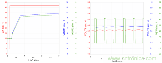 圖6:在WEBENCH電源設(shè)計(jì)工具中針對(duì)一個(gè)Fly-Buck設(shè)計(jì)生成的啟動(dòng)和穩(wěn)定狀態(tài)波形