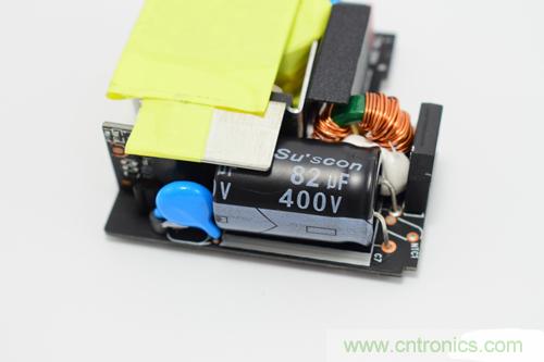 全橋整流后的一次側(cè)濾波電源為一枚82μF/400V 電容,來自SUSCON(臺灣冠坤)。從此角度看,屬于保護電路的NTC空缺未安裝。