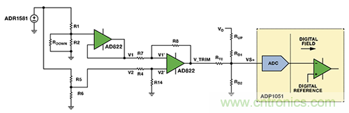 圖5中的電路具有兼容模擬向上或者向下調(diào)壓的功能。兩個(gè)電阻分壓器產(chǎn)生兩個(gè)基準(zhǔn)電壓,其中一個(gè)基準(zhǔn)電壓表示模擬控制器所需的輸出基準(zhǔn)電壓,另一個(gè)表示內(nèi)部基準(zhǔn)電壓。利用一個(gè)電壓跟隨器來避免所需的輸出基準(zhǔn)電壓與后續(xù)電路相互影響。利用AD822 FET輸入運(yùn)算放大器,將所需的輸出基準(zhǔn)電壓 (V1) 從模擬控制器的內(nèi)部基準(zhǔn)電壓 (V2) 中去除,得到所需的電壓差。此電路的線性放大增益確保了VTRIM足夠大,從而能對(duì)VVS+產(chǎn)生影響。