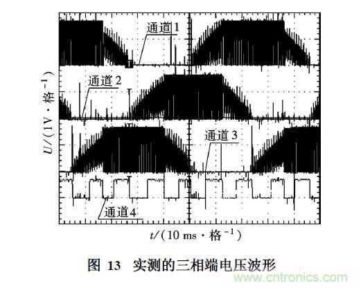 圖13為實測的三相端電壓波形(通道1~通道3) ,通道4的上升沿和下降沿分別對應(yīng)過零點和換相點.