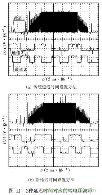 2種延遲時間設(shè)置方法對應(yīng)的實測端電壓波形(通道1)如圖12所示,通道2和通道3為過零點檢測波形,通道2的上升沿和下降沿對應(yīng)于過零點,而通道3的上升沿和下降沿分別對應(yīng)過零點和換相點.