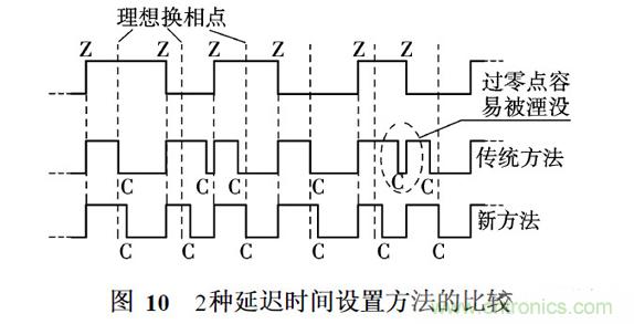 采用傳統(tǒng)的延遲時間設(shè)置方法,某些換相點偏離理想換相點較大. 當(dāng)某次換相嚴重滯后時,下次過零點容易被湮沒,導(dǎo)致電機失步,如圖10所示.