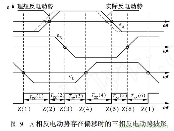 假設(shè)A 相反電動勢存在相位偏移, 波形上升和下降部分上的過零點滯后出現(xiàn),導(dǎo)致過零點在時間軸上分布不均勻. 如圖9所示, 虛線表示理想反電動勢,實線表示存在相位偏移的實際反電動勢,過零點的間隔時間TZZ (1) , TZZ ( 2)和TZZ ( 3)不相等. 每相反電動勢波形上升和下降部分的2個過零點相差180°電角度, 過零點間隔時間存在著周期性規(guī)律,如TZZ ( 1) =TZZ ( 4) , TZZ ( 2) = TZZ ( 5)和TZZ (3) = TZZ (6) .