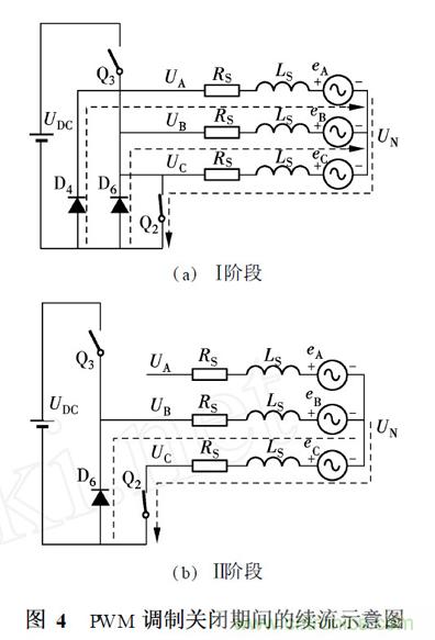 AC 和AB 區(qū)為A 相上橋臂開關(guān)PWM 調(diào)制階段. 以AC區(qū)為例,在PWM 開通期間, Q1 和Q2 導(dǎo)通, A 相繞組與直流側(cè)電壓的正極相連, 端電壓為UDC ;在PWM 關(guān)閉期間, Q1 關(guān)閉, Q2 導(dǎo)通,由于繞組阻抗呈感性, A 相下橋臂的反并聯(lián)二極管D4 導(dǎo)通續(xù)流,此時A 相繞組與直流側(cè)電壓的負極相連,端電壓為零.