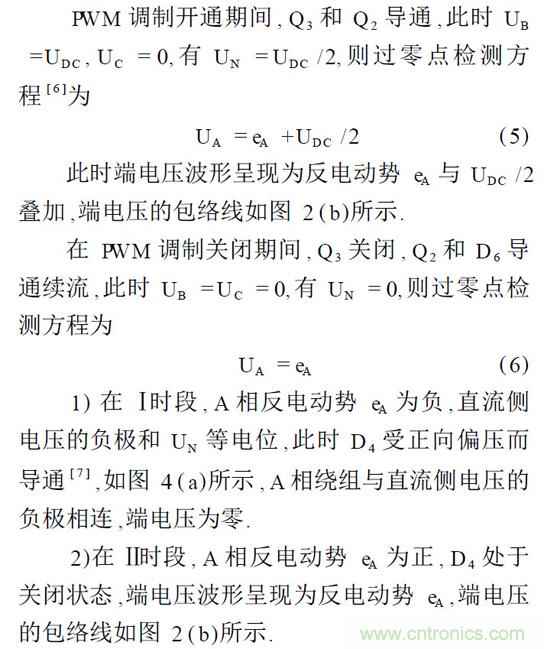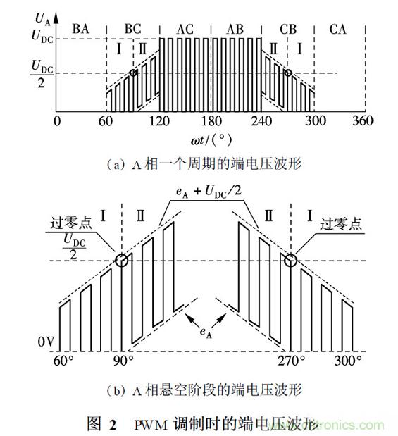分析了上橋臂PWM 調(diào)制、下橋臂恒通調(diào)制方式時的端電壓波形,討論相應(yīng)的反電動勢過零點檢測方法. 在PWM 調(diào)制信號開通狀態(tài)結(jié)束時刻對端電壓進行采樣,由軟件算法確定反電動勢過零點. 針對電機運行時存在超前換相或滯后換相的情況,通過設(shè)置合理的延遲時間來實現(xiàn)最佳換相. 針對實際電機存在反電動勢過零點分布不均勻的情況,根據(jù)過零點間隔時間存在著周期性規(guī)律,提出一種新的延遲時間設(shè)置方法,使換相點位于相鄰過零點的中間位置,實現(xiàn)了電機的準(zhǔn)確換相. 實驗驗證了所提出方法的可行性和有效性.