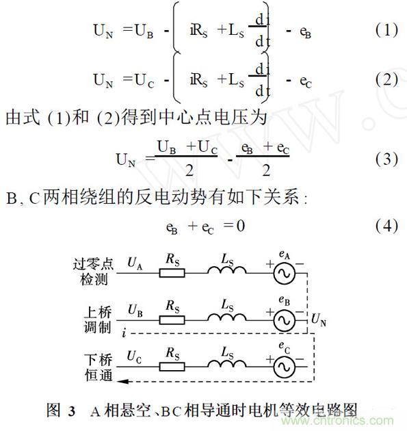 BC和CB 區(qū)為A 相懸空階段,將2個區(qū)域各自分為Ⅰ和Ⅱ兩個時段,如圖2 ( b)所示. 以BC 區(qū)為例,此時電流從B 相繞組流進, C 相繞組流出,如圖3所示. 圖中, RS 和LS 分別表示定子繞組的等效電阻和電感, UN 為電機中心點電壓, i為相電流. 忽略功率開關(guān)和二極管的正向?qū)▔航? 根據(jù)基爾霍夫電壓定律可得