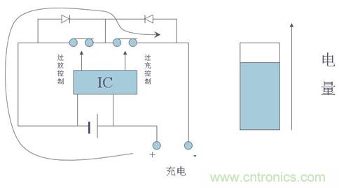 在帶有保護電路的電池中,當(dāng)控制IC檢測到電池電壓達(dá)到4.28V(該值由控制IC決定,不同的IC有不同的值)時,其“CO”腳將由高電壓轉(zhuǎn)變?yōu)榱汶妷海筎1由導(dǎo)通轉(zhuǎn)為關(guān)斷,從而切斷了充電回路,使充電器無法再對電池進行充電,起到過充電保護作用。而此時由于T1自帶的體二極管VD1的存在,電池可以通過該二極管對外部負(fù)載進行放電。