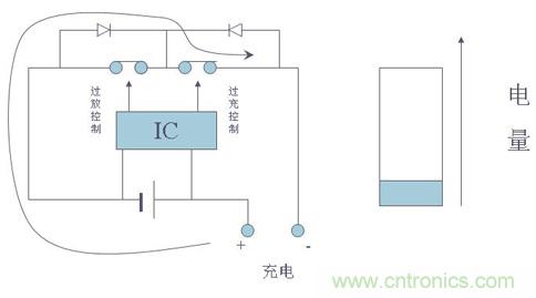 電池在被充電過程中,如果充電器電路失去控制,會使電池電壓超過4.2V后繼續(xù)恒流充電,此時電池電壓仍會繼續(xù)上升,當(dāng)電池電壓被充電至超過4.3V時,電池的化學(xué)副反應(yīng)將加劇,會導(dǎo)致電池?fù)p壞或出現(xiàn)安全問題。