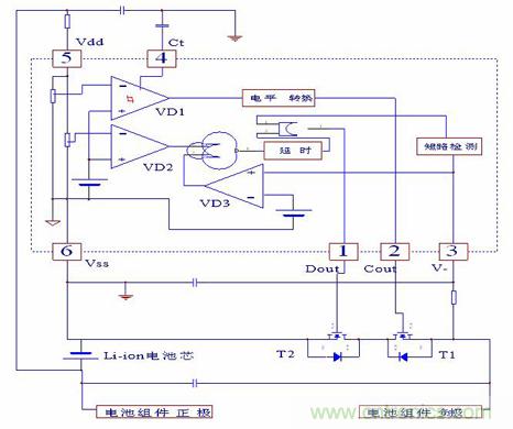 當(dāng)電池電壓因放電而降低至設(shè)定值VD(2.3-2.5V)時, VD2翻轉(zhuǎn),以IC內(nèi)部固定的短時間延時后,使Dout變?yōu)榈碗娖?,T2截止,放電停止。