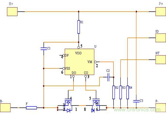 在正常狀態(tài)下電路中N1的“CO”與“DO”腳都輸出高電壓,兩個MOSFET都處于導(dǎo)通狀態(tài),電池可以自由地進行充電和放電,由于MOSFET的導(dǎo)通阻抗很小,通常小于30毫歐,因此其導(dǎo)通電阻對電路的性能影響很小。