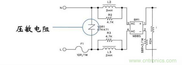 ■大功率設(shè)備斷開或接入電網(wǎng)時(shí),會(huì)使得電網(wǎng)電壓上升或跌落。為了保 護(hù)電源,有時(shí)會(huì)使用一個(gè)壓敏電阻接在輸入端。