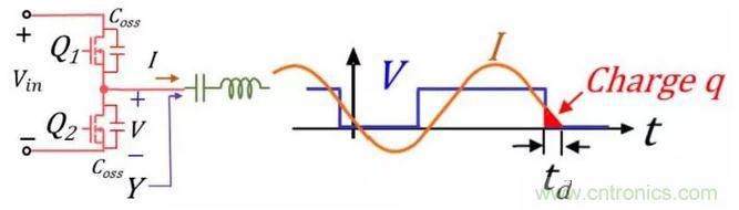 這是因?yàn)槿绻娏鱅是滯后與電壓V的,這樣在Q1開(kāi)啟之前電流I為負(fù)值就會(huì)charge Q2的Coss,同時(shí)discharge Q1的Coss,讓V到Vin,這樣Q1就實(shí)現(xiàn)ZVS turn on了。Q2開(kāi)啟之前,電流I為正,也會(huì)discharge Q2的Coss,和charge Q1的Coss,讓V到0,這樣Q2就實(shí)現(xiàn)ZVS了。