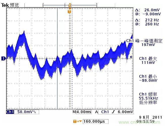 低頻紋波是與輸出電路的濾波電容容量相關(guān)。由于開關(guān)電源體積的限制,電解電容的容量不可能無限制地增加,導(dǎo)致輸出低頻紋波的殘留,該輸出紋波頻率隨整流電路方式的不同而不同。