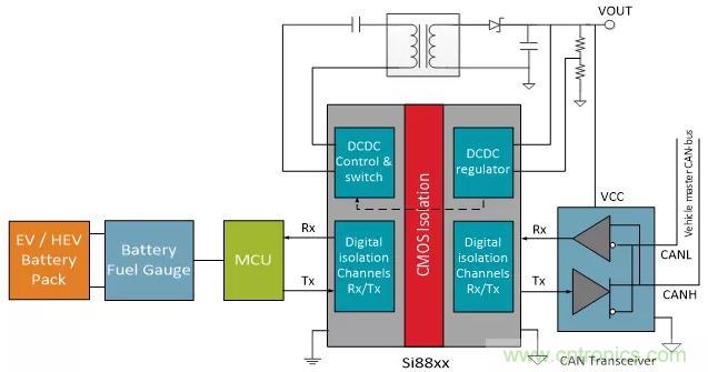 如圖3所示,這個(gè)簡(jiǎn)化的BMS系統(tǒng)展示了在與一個(gè)EV子系統(tǒng)進(jìn)行連接時(shí)信號(hào)和電源隔離的重要性。在大多數(shù)EV子系統(tǒng)中,CAN總線(xiàn)通過(guò)數(shù)字隔離與該子系統(tǒng)中的高壓隔離。現(xiàn)代數(shù)字隔離兩側(cè)各需要一個(gè)電源為隔離器供電(高壓域和低壓域)。該電源也可為連接到隔離器的其他設(shè)備供電,例如CAN總線(xiàn)收發(fā)器。