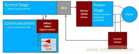 這些系統(tǒng)需要在馬達(dá)控制器和功率晶體管之間采用隔離驅(qū)動(dòng)器。隔離允許低壓控制器安全地開(kāi)關(guān)高功率晶體管以產(chǎn)生交流波形。此外,馬達(dá)控制系統(tǒng)中可能存在隔離的CAN總線(xiàn),并且有某些方法可以感測(cè)驅(qū)動(dòng)馬達(dá)的電流,以監(jiān)控速度和轉(zhuǎn)矩。圖4展示了一個(gè)使用一系列數(shù)字隔離設(shè)備的簡(jiǎn)化的牽引馬達(dá)控制系統(tǒng)。