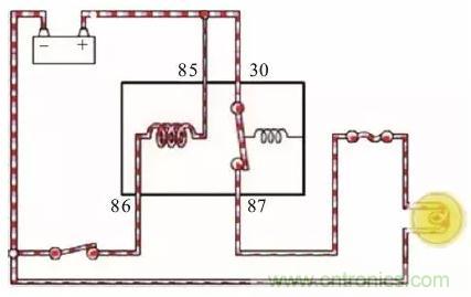 五腳繼電器工作原理與四腳繼電器基本相同,只是在繼電器不工作的時(shí)候有一觸點(diǎn)一直處于常閉狀態(tài)。如下圖所示,當(dāng)繼電器線圈85#和86#端子通電后,線圈吸引觸點(diǎn)從87a#端子運(yùn)動(dòng)到87#端子,使30#端子與87#端子接通,所以五腳繼電器也叫做樞紐繼電器,可以起到一個(gè)轉(zhuǎn)換的功能。