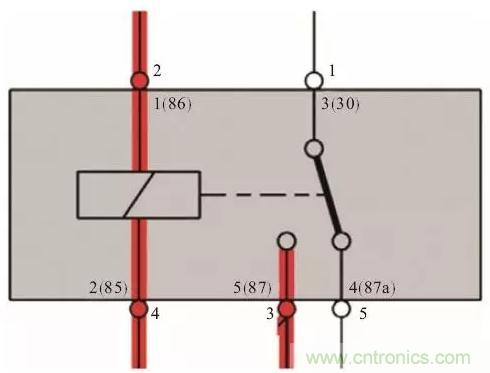 如下圖所示,85#和86#端子是線圈,屬于控制部分;87#和30#端子是觸點(diǎn),屬于被控制部分(即輸出端)。
