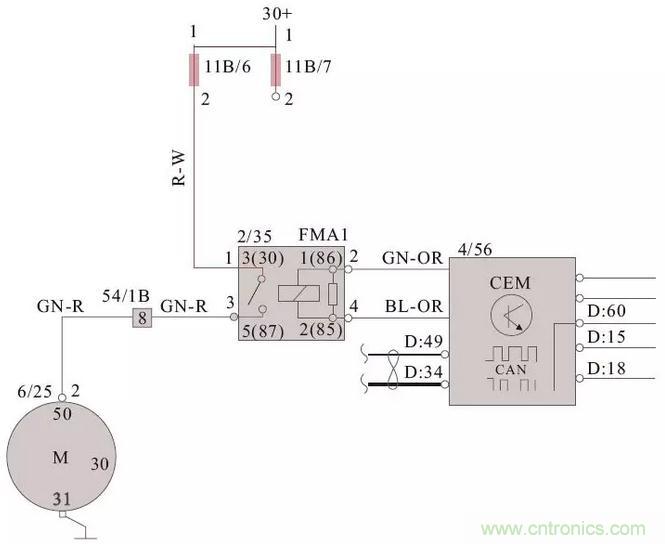 繼電器在汽車電路中的應(yīng)用非常廣泛。如啟動(dòng)系統(tǒng)電路、雨刮器電路、后窗加熱電路等。車輛啟動(dòng)時(shí)需要大的啟動(dòng)電流,如果使用點(diǎn)火開關(guān)直接控制大電流經(jīng)過(guò)的點(diǎn)火開關(guān),啟動(dòng)觸點(diǎn)會(huì)出現(xiàn)觸點(diǎn)打火、燒蝕等現(xiàn)象,影響點(diǎn)火開關(guān)使用壽命甚至?xí)斐删€路燒蝕、起火等嚴(yán)重后果。使用繼電器以小電流控制大電流則不會(huì)出現(xiàn)以上問(wèn)題。