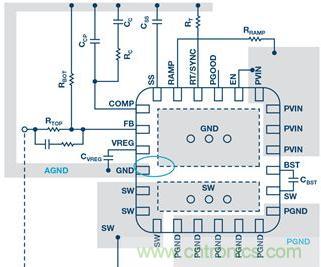 AGND 有時被稱為 SGND(信號接地層),是其他信號用作參照的接地連接,通常十分平靜。該接地層包括調(diào)節(jié)輸出電壓所需的內(nèi)部基準(zhǔn)電壓。軟啟動和使能電壓也以 AGND 連接為參照。