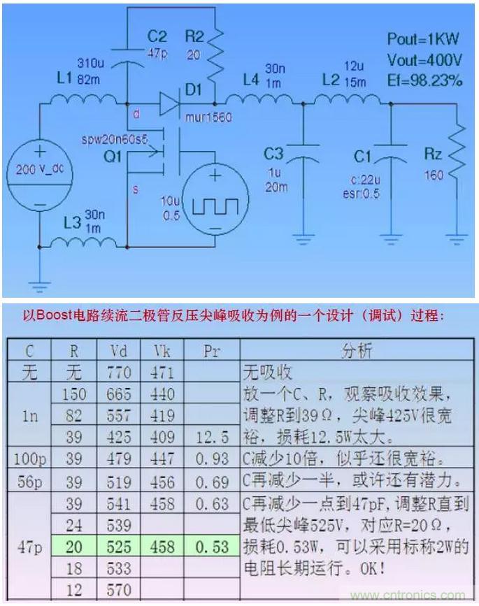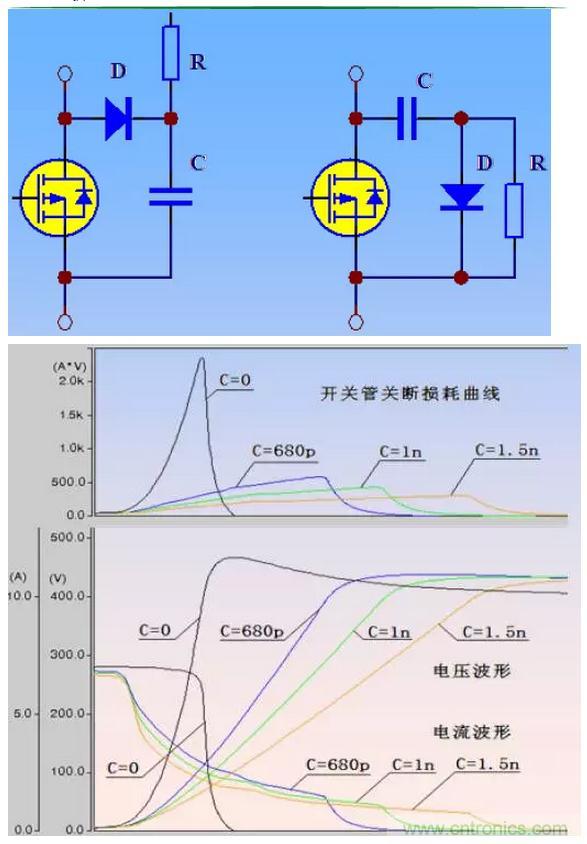 C 的大小決定吸收效果(電壓尖峰),同時決定了吸收功率(即R的熱功率)。