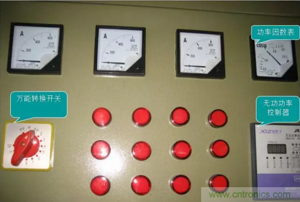 三個(gè)電流表A、一個(gè)功率因數(shù)表COS;功率控制器PK;萬(wàn)能轉(zhuǎn)換開(kāi)關(guān)