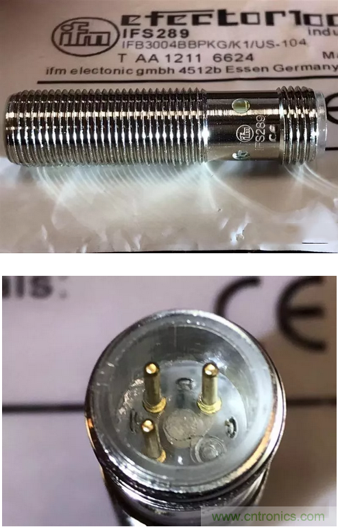 圖二、ifm正品的針腳是鍍金處理的,仿品內(nèi)套是塑料的針腳是黃銅的。