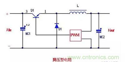 如下圖為降壓型電路。在此電路中,脈寬調(diào)制(pwm)電路的輸出加到晶體管開關(guān)Q1的基極,以控制其導(dǎo)通和截止。