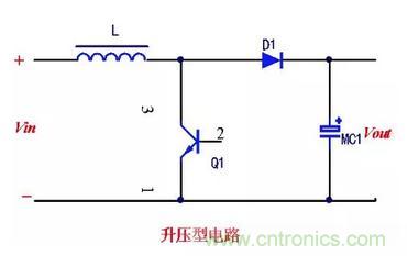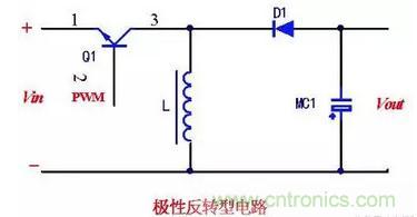 如下圖為極性反轉(zhuǎn)型電路,也叫倒置型電路。當Q1導(dǎo)通時,uin加在l兩端,產(chǎn)生電流和儲存能量。Q1截止后,l上的電流經(jīng)二極管D1給電容器MC1充電。由此產(chǎn)生與輸人電壓極性相反的輸出電壓。