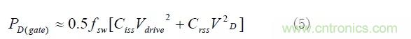 功率MOSFET驅(qū)動效率比雙極型功率晶體管高。MOSFET柵極有兩個與漏源極相連的等效電容,即柵源電容Ciss和漏源電容Crss。MOSFET柵極驅(qū)動的損耗來自于開通MOSFET時輔助電壓對柵極電容的充電,關(guān)斷MOSFET時又對地放電。柵極驅(qū)動損耗計算由式(5)給出。