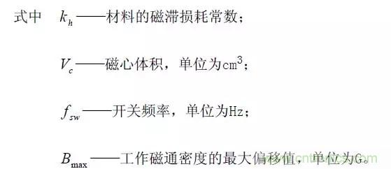磁滯損耗與繞組的匝數(shù)和驅(qū)動方式有關(guān)。它決定了每個工作周期在B-H曲線內(nèi)掃過的面積。掃過的面積就是磁場力所作的功,磁場力使磁心內(nèi)的磁疇重新排列,掃過的面積越大,磁滯損耗就越大。該損耗由式(6)給出。