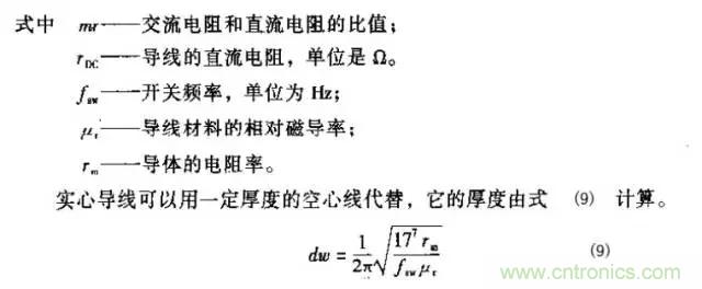 電阻損耗是變壓器或電感內(nèi)部繞組的電阻產(chǎn)生的損耗。有兩種形式的電阻損耗:直流電阻損耗和集膚效應(yīng)電阻損耗。直流電阻損耗由繞組導(dǎo)線的電阻與流過的電流有效值二次方的乘積所決定。集膚效應(yīng)是由于在導(dǎo)線內(nèi)強交流電磁場作用下,導(dǎo)線中心的電流被“推向”導(dǎo)線表面而使導(dǎo)線的電阻實際增加所致,電流在更小的截面中流動使導(dǎo)線的有效直徑顯得小了。式(8)給出了這兩個損耗在一個表達(dá)式中的計算式。