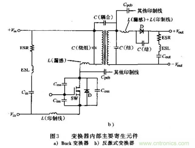 在所有開關(guān)電源中,有一些常見的寄生參數(shù),在觀察變換器內(nèi)主要交流節(jié)點的波形時,可以明顯看到它們的影響。有些器件的數(shù)據(jù)資料中,甚至給出了這些參數(shù),如MOSFET的寄生電容。兩種常見變換器的主要寄生參數(shù)見圖3。