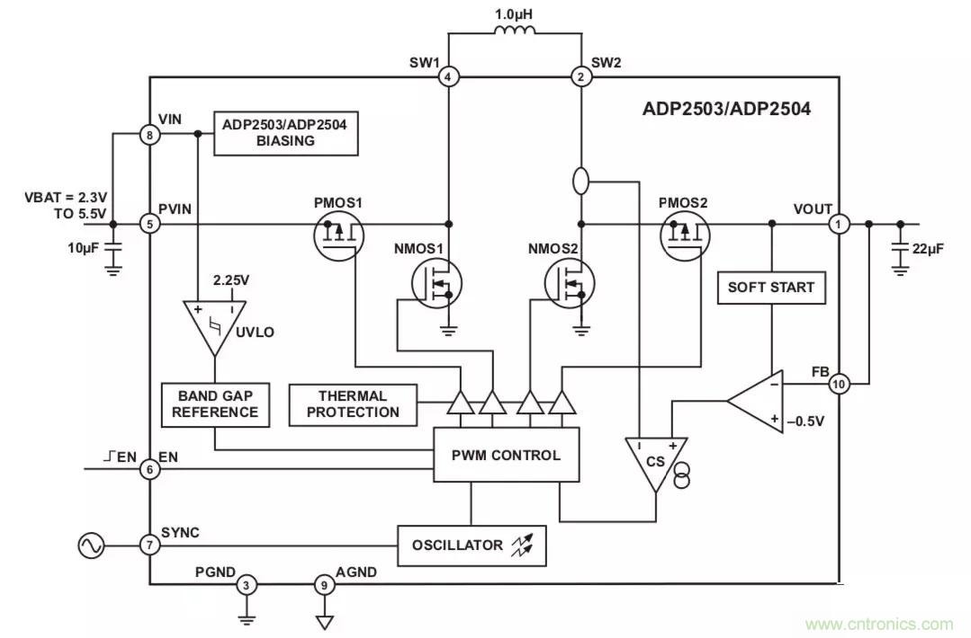 這樣的器件譬如ADI公司的ADP2503和ADP2504降壓-升壓轉(zhuǎn)換器,它們內(nèi)置四個(gè)開(kāi)關(guān)、兩個(gè)電容和一個(gè)電感。