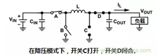 在降壓模式下, 降壓-升壓轉(zhuǎn)換器工作如下圖,Vin大于Vout時(shí),開(kāi)關(guān)C打開(kāi),開(kāi)關(guān)D閉合。