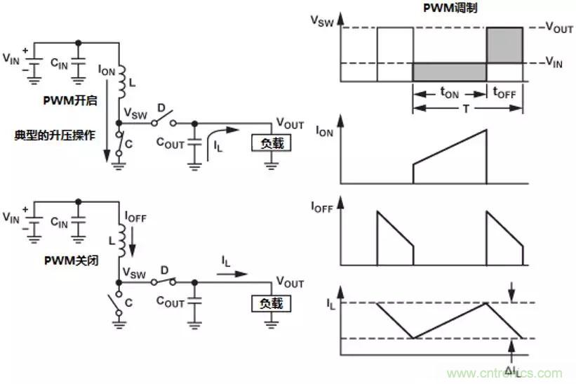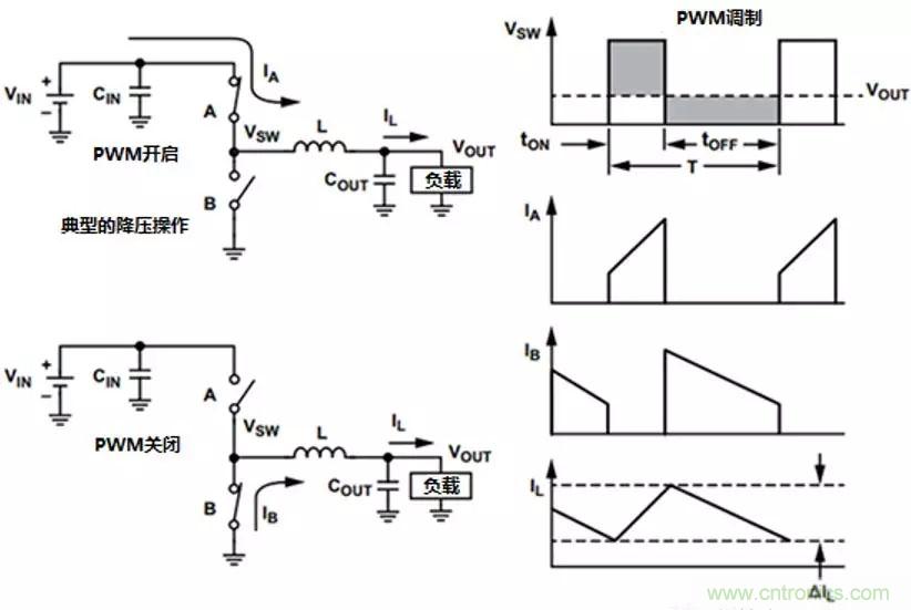 占空比 = 開(kāi)關(guān)開(kāi)通的時(shí)間/ 工作同周期。開(kāi)通和關(guān)閉開(kāi)關(guān)影響了電感能量的儲(chǔ)存和釋放,從而影響輸出的電壓。