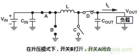 在升壓模式下,Vin小于Vout 時(shí),開(kāi)關(guān)B打開(kāi),開(kāi)關(guān)A閉合。這時(shí),開(kāi)關(guān)C和開(kāi)關(guān)D的工作模式如下圖表示。