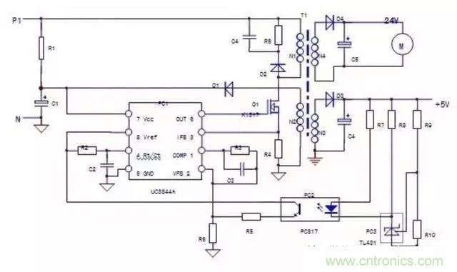 B.對(duì)UC3844單獨(dú)上電,短接PC2輸入側(cè),若電路起振,說(shuō)明故障在PC2輸入側(cè)外圍電路;電路不起振則檢查輸出側(cè)電路。
