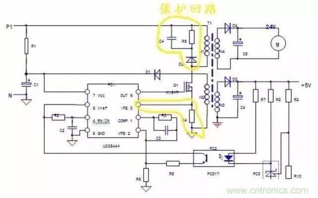 3)保護(hù)回路:PC1芯片本身和3腳外圍元件R4構(gòu)成過(guò)電流保護(hù)回路;N1繞組上并聯(lián)的D2,R6,C4元件構(gòu)成了開(kāi)關(guān)管的反壓吸收保護(hù)電路;實(shí)質(zhì)上穩(wěn)壓回路的電壓反饋信號(hào)——穩(wěn)壓信號(hào),也可看作一路電壓保護(hù)信號(hào),但保護(hù)電路的內(nèi)容并不僅是局限于保護(hù)電路本身,保護(hù)電路的啟控往往是由于負(fù)載電路異常所引起的。