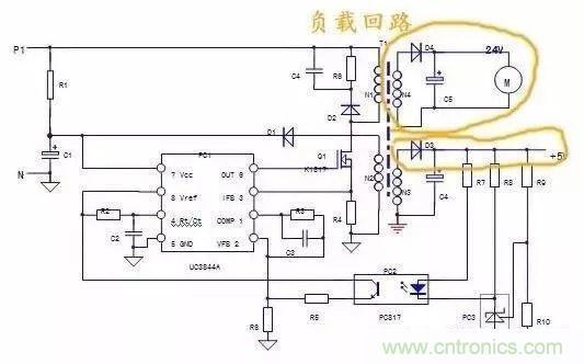 4)負(fù)載回路:N3,N4二次繞組及后續(xù)電路,均為負(fù)載回路,負(fù)載回路的異常,會(huì)牽涉到保護(hù)回路和穩(wěn)壓回路,使兩個(gè)回路做出相應(yīng)的保護(hù)和調(diào)整動(dòng)作。