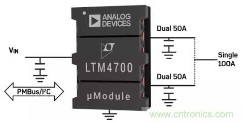 圖1:LTM4700雙50A或單100AμModule®穩(wěn)壓器